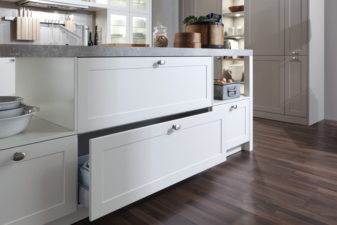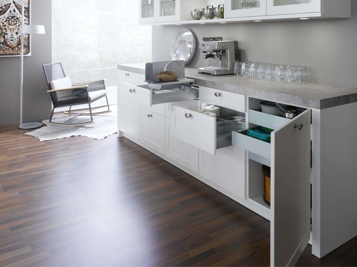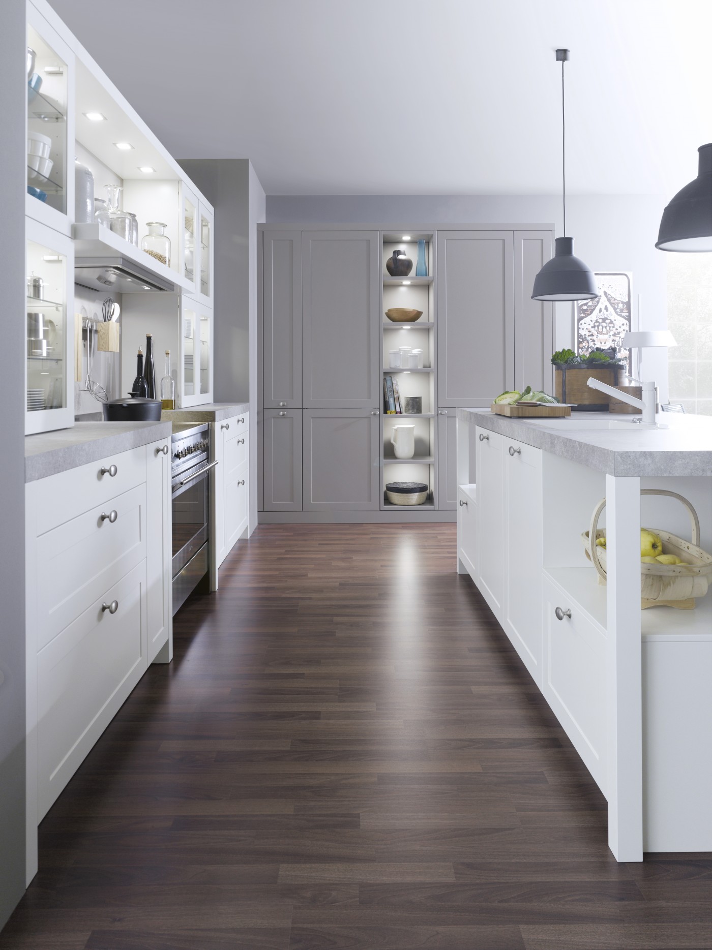 The silk-matt lacquered fronts of the CARRÄ–-FS Leicht kitchen units is enhanced by the simple, yet elegant frames. They give a contemporary look to a classic kitchen feel while fusing the two looks. The chosen colour scheme of radiant white and soft grey complement each other and ensure the kitchen has a modern, clean look.