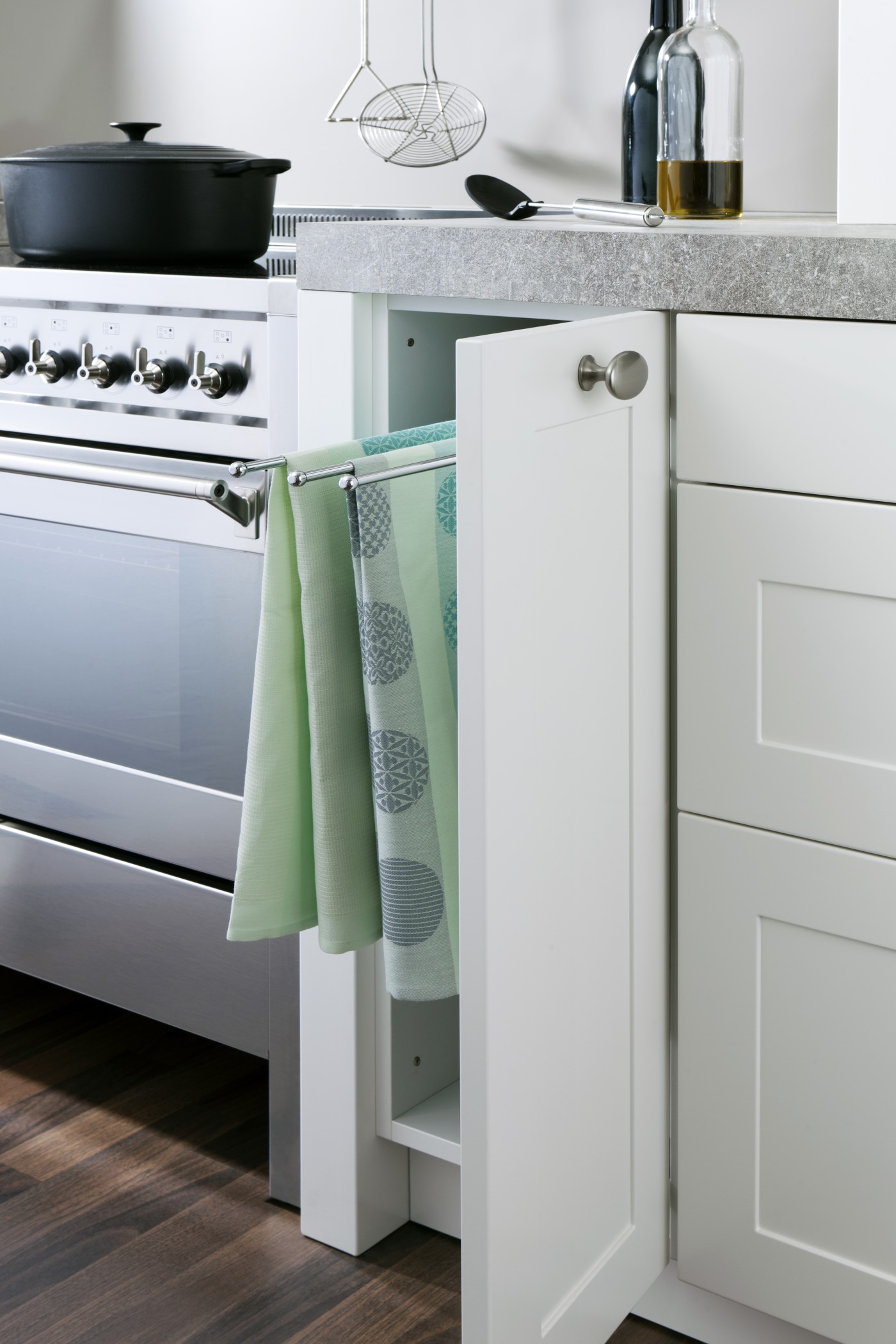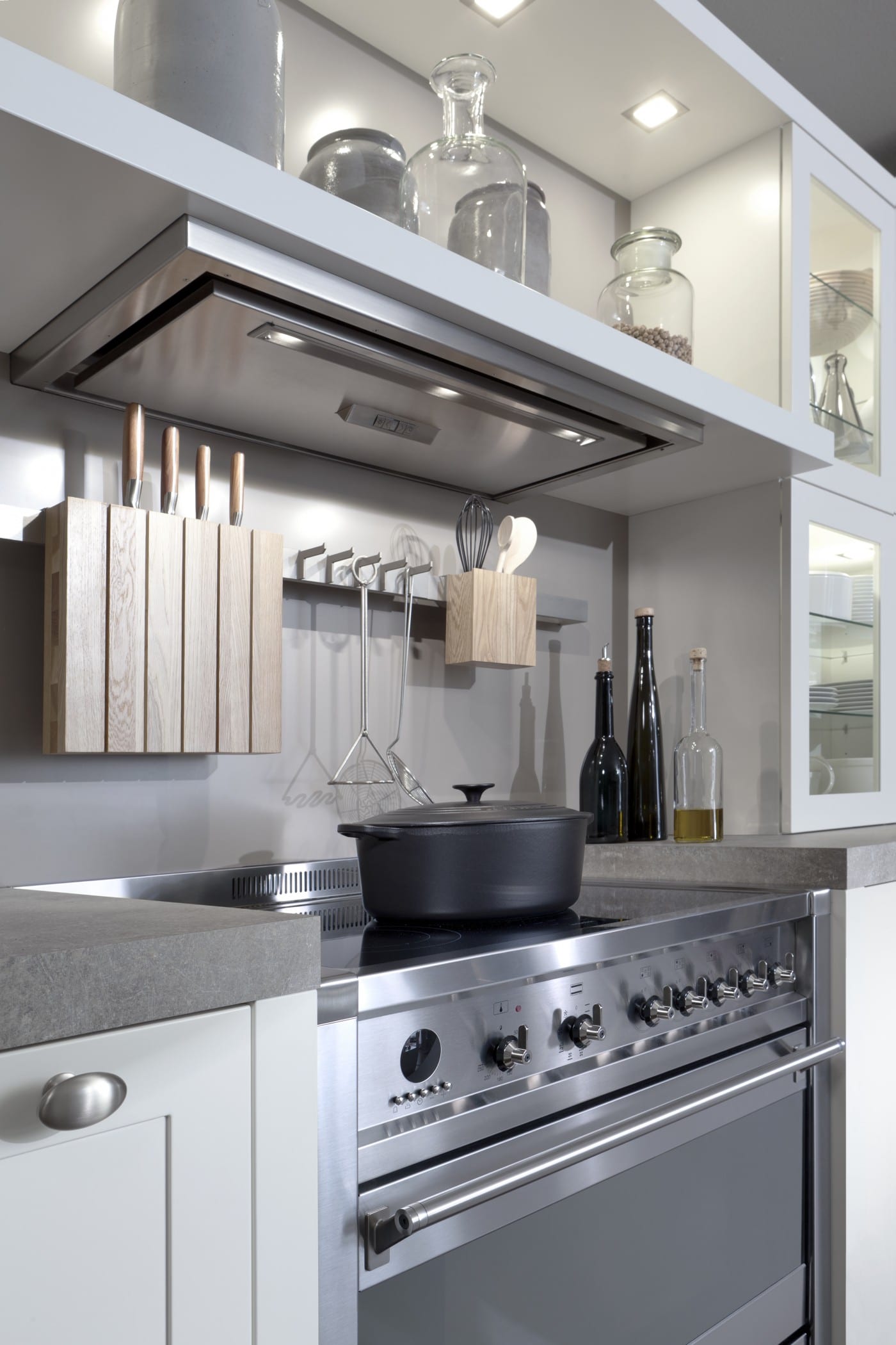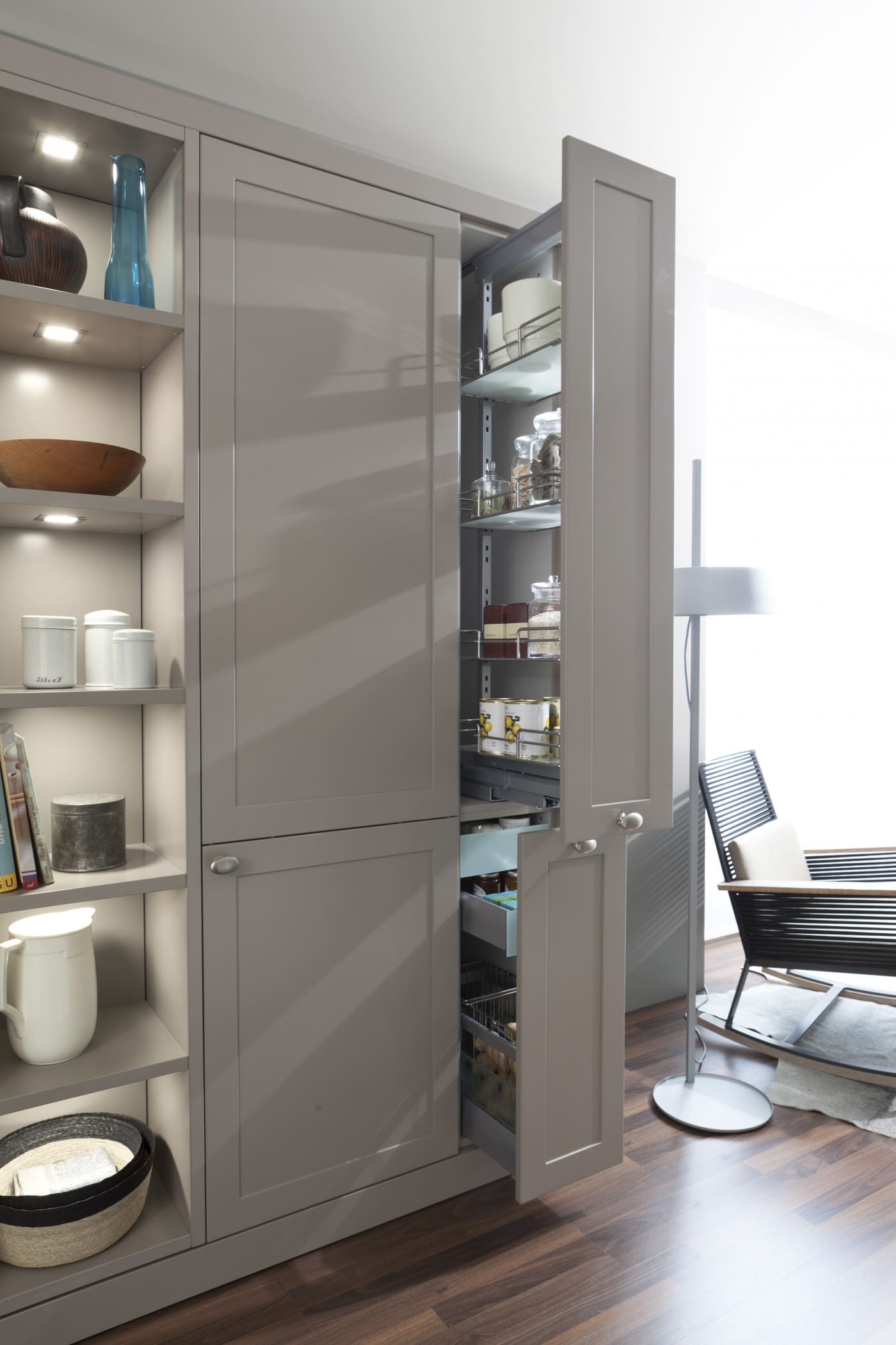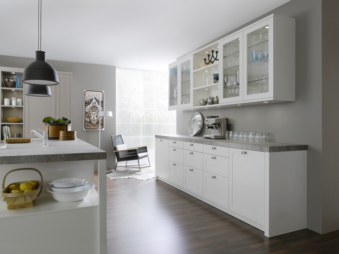 The silk-matt lacquered fronts of the CARRÄ–-FS Leicht kitchen units is enhanced by the simple, yet elegant frames. They give a contemporary look to a classic kitchen feel while fusing the two looks. The chosen colour scheme of radiant white and soft grey complement each other and ensure the kitchen has a modern, clean look.