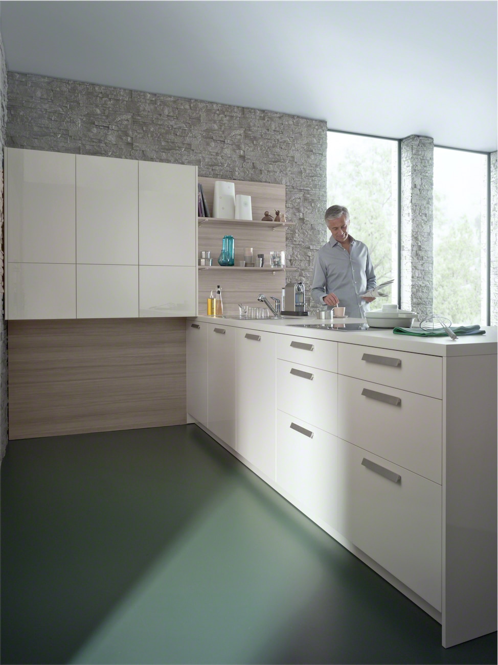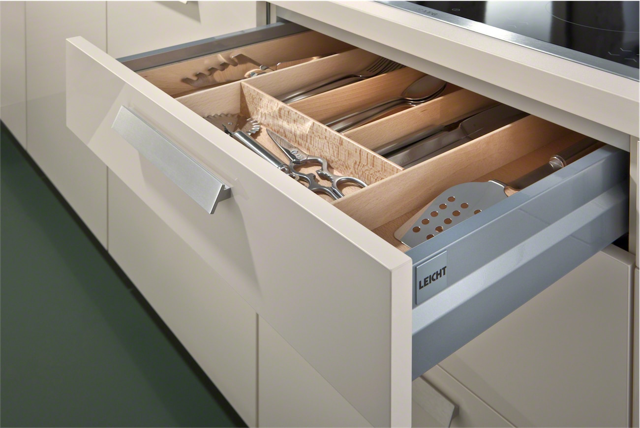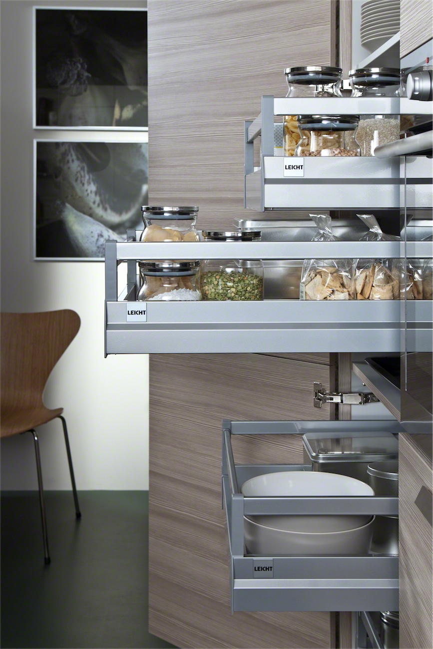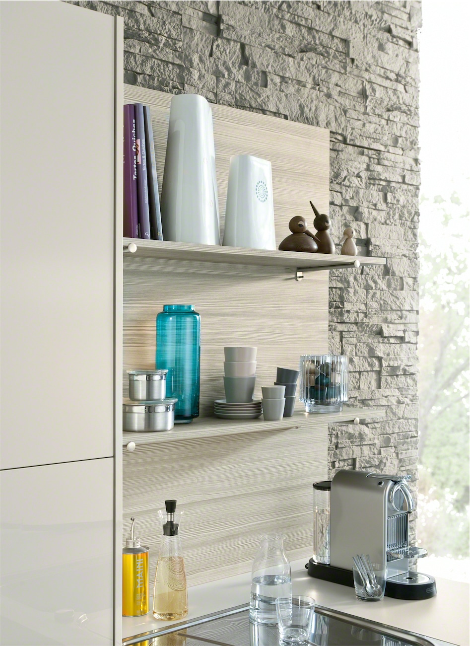 This stylish design with high gloss acrylic fonts and horizontally grained matt mountain-larch are the latest trend in kitchen architecture. Handle-less wall units with a touch opening mechanism create a simplistic aesthetic that gives the room a classy quality. The elegant kitchen top with its smooth surface perfectly completes the overall appearance of the kitchen.