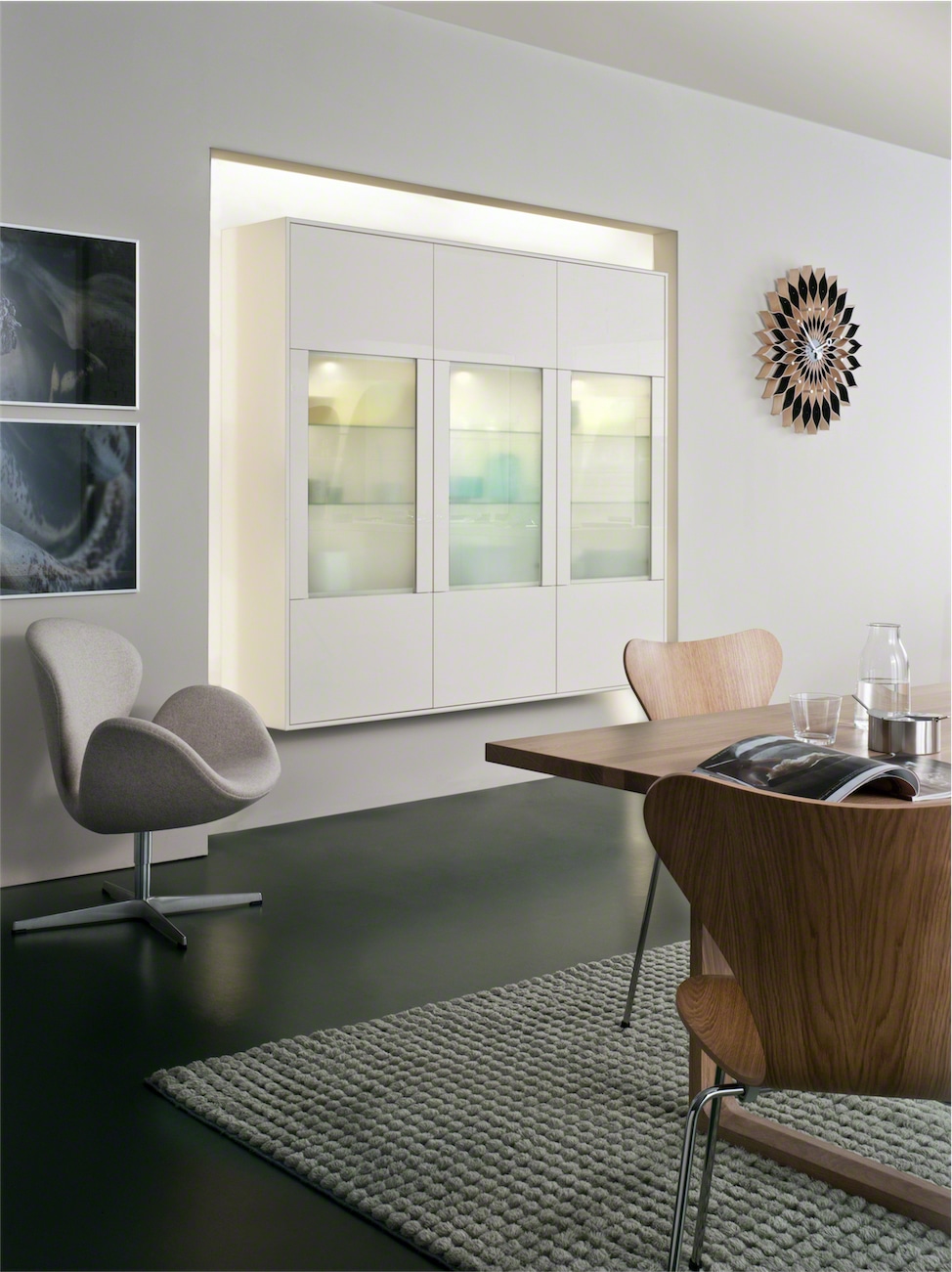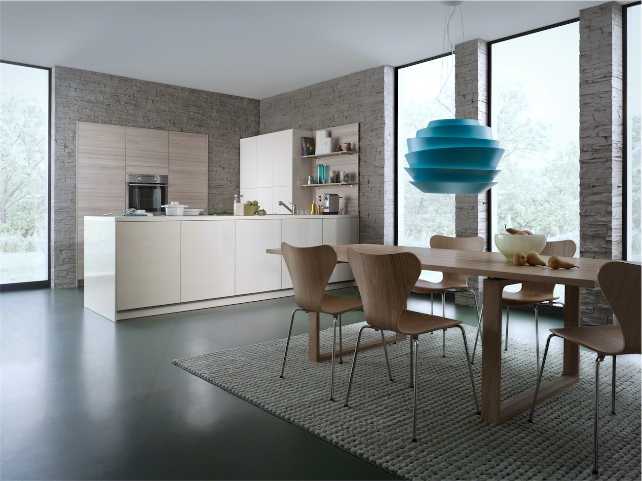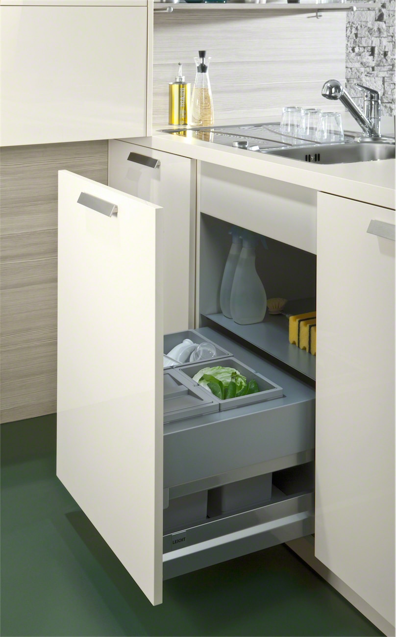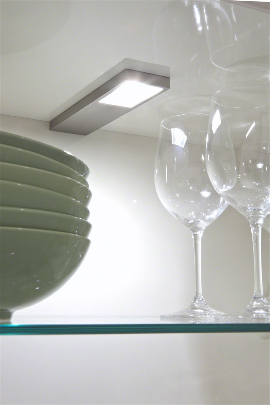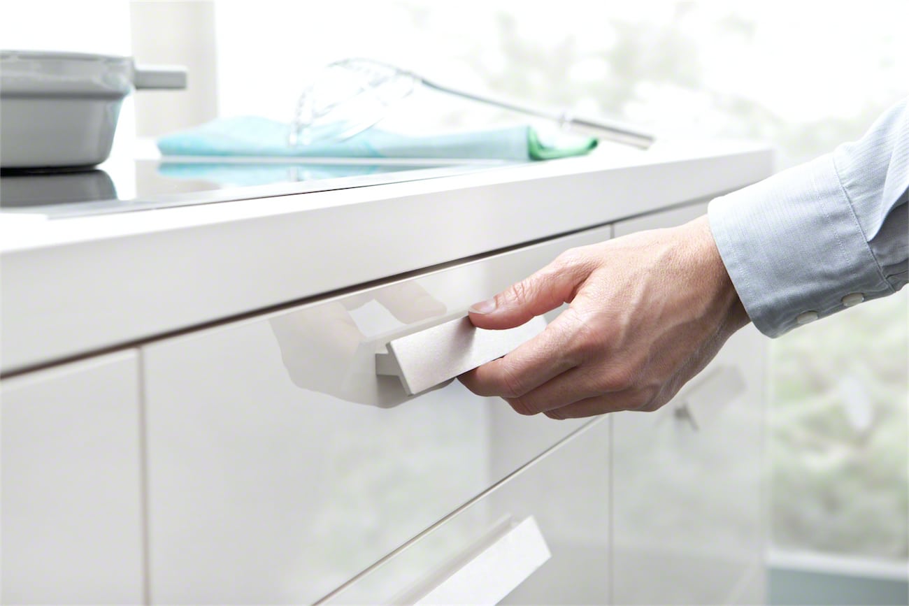 This stylish design with high gloss acrylic fonts and horizontally grained matt mountain-larch are the latest trend in kitchen architecture. Handle-less wall units with a touch opening mechanism create a simplistic aesthetic that gives the room a classy quality. The elegant kitchen top with its smooth surface perfectly completes the overall appearance of the kitchen.