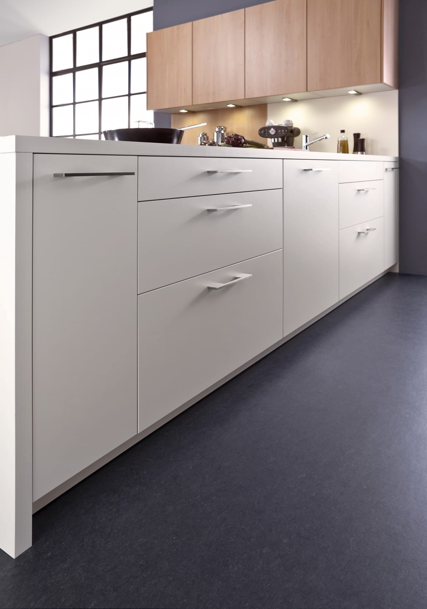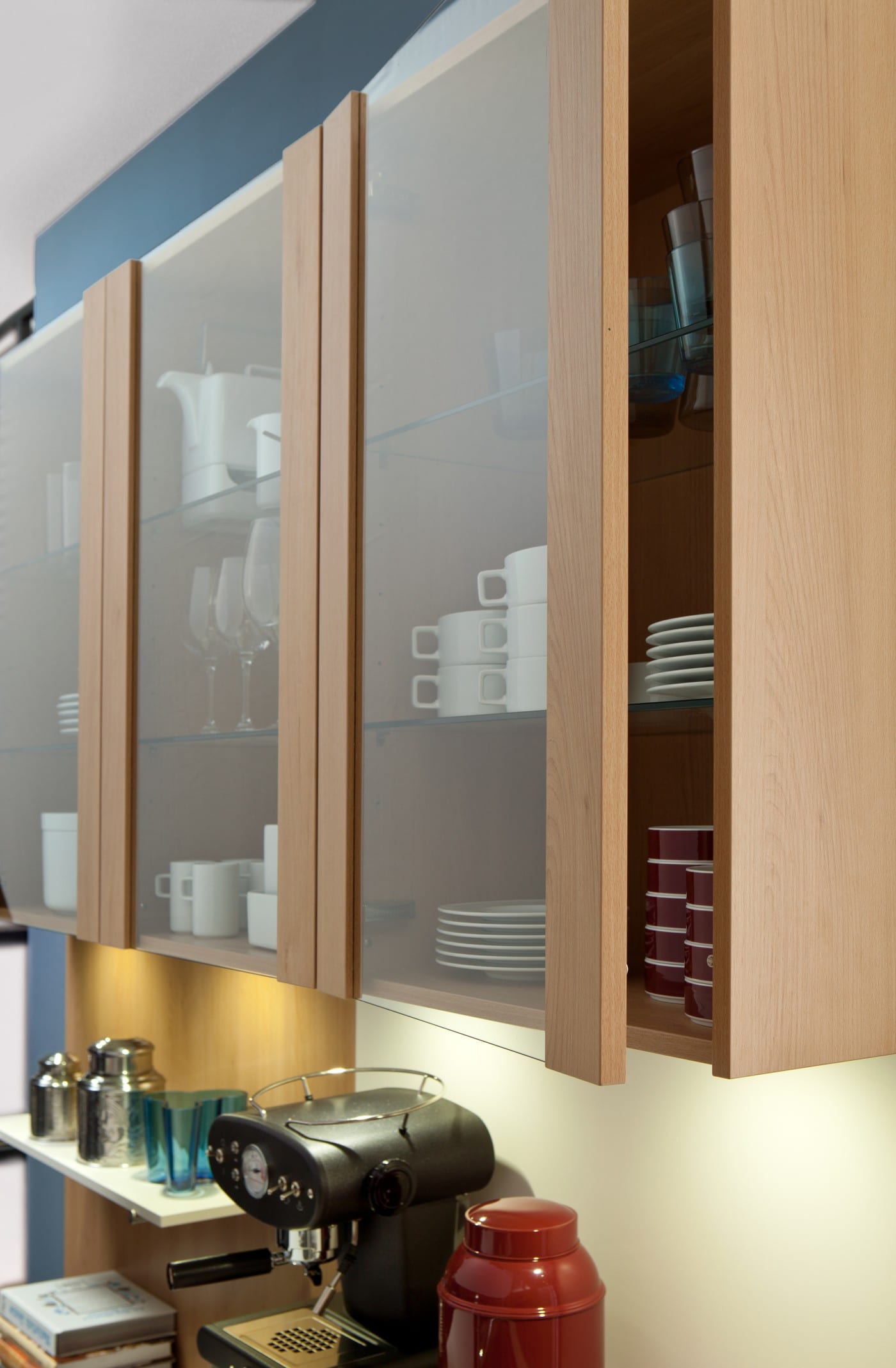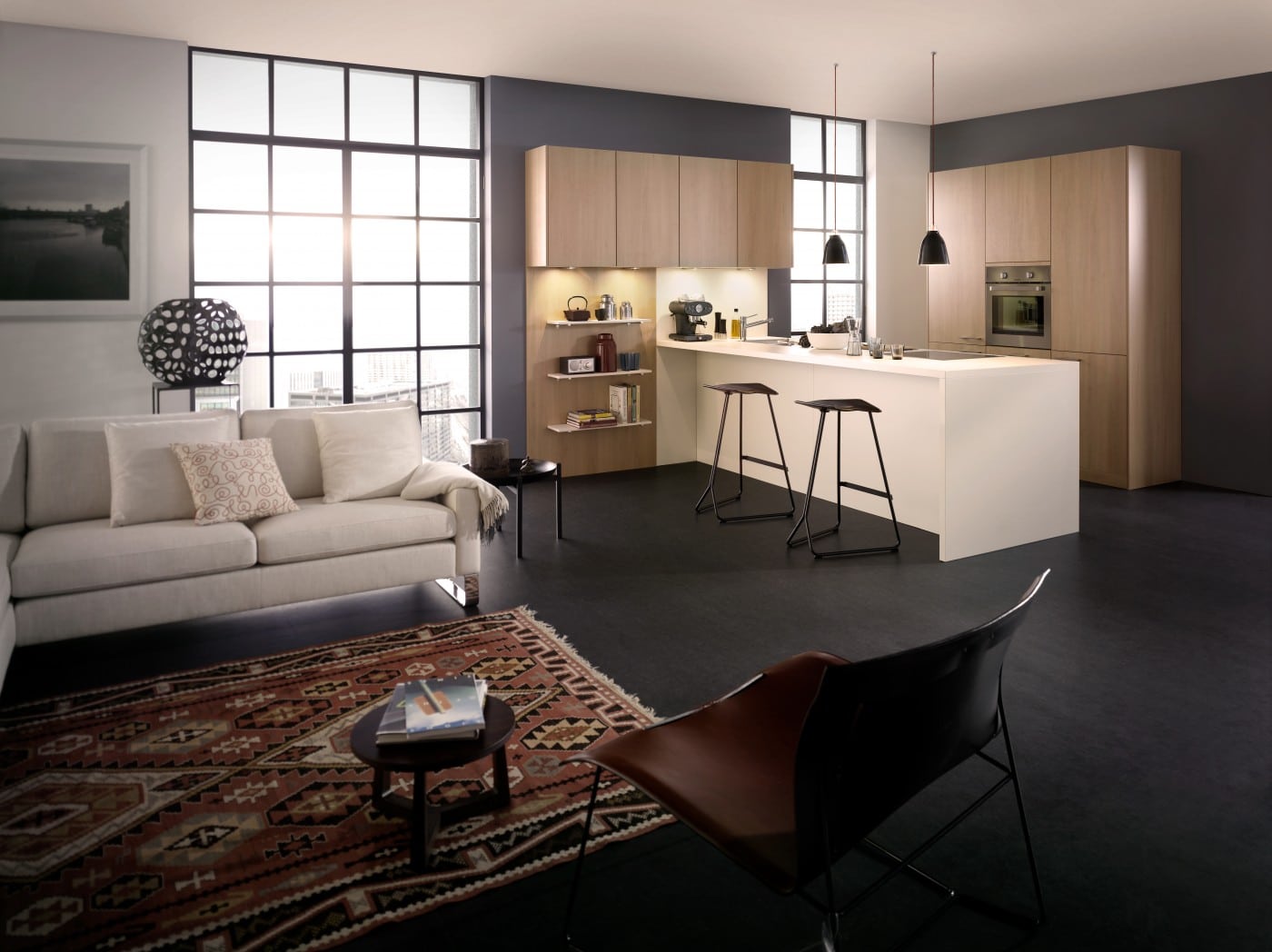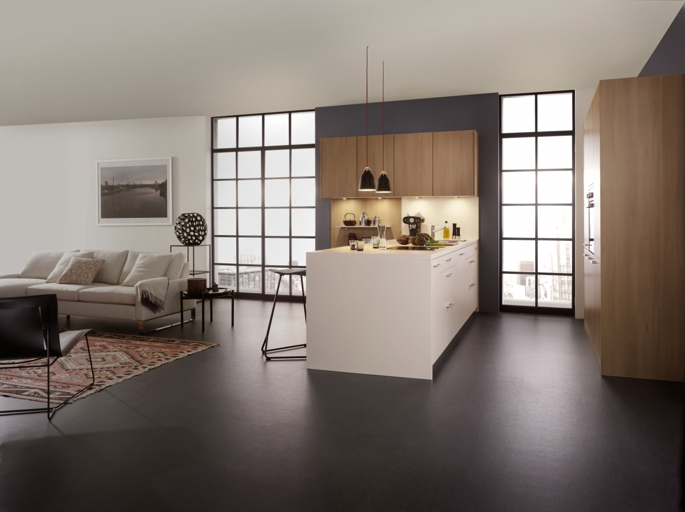 Homeliness and functionality need not necessarily be separate. Light wood décor, combined with magnolia white fronts and cheerful lighting. The opening towards the living room and the integration of living room elements into the kitchen are some of the choices. The isle unit marks the transition from the working to the living area. Colour matching side panels and the worktop flush with the front, give the isle a block-like appearance. Handle-less wall units with attached LED-lights bridge the isle and the open shelf unit.