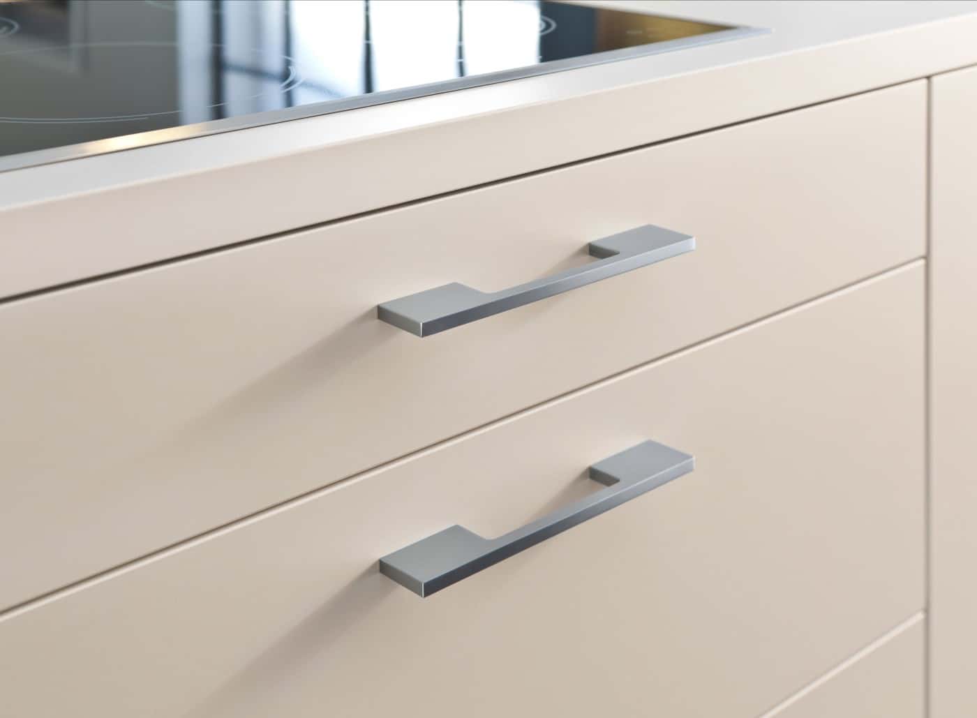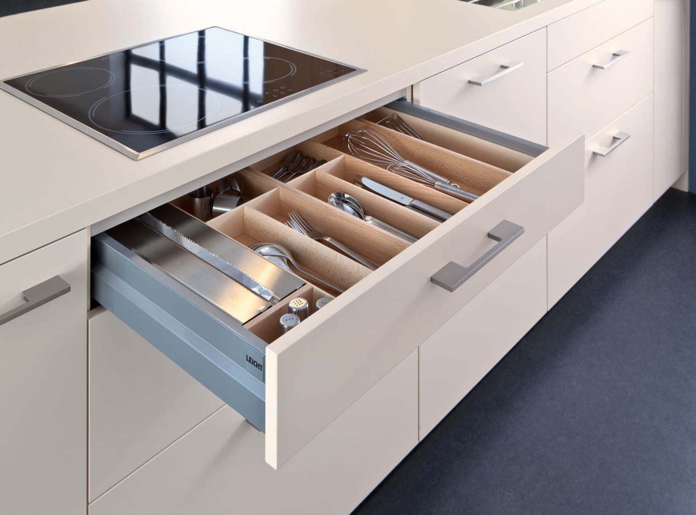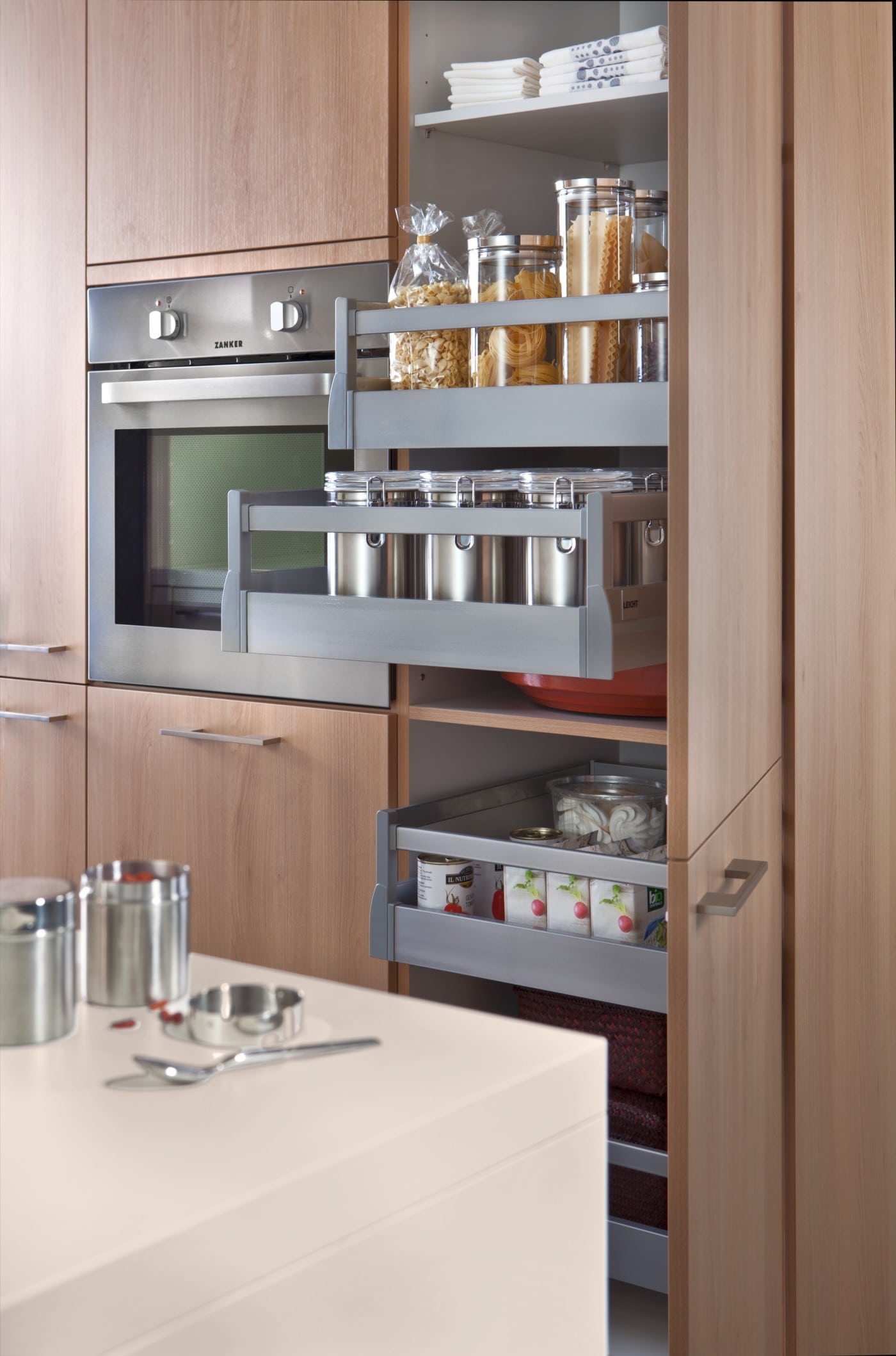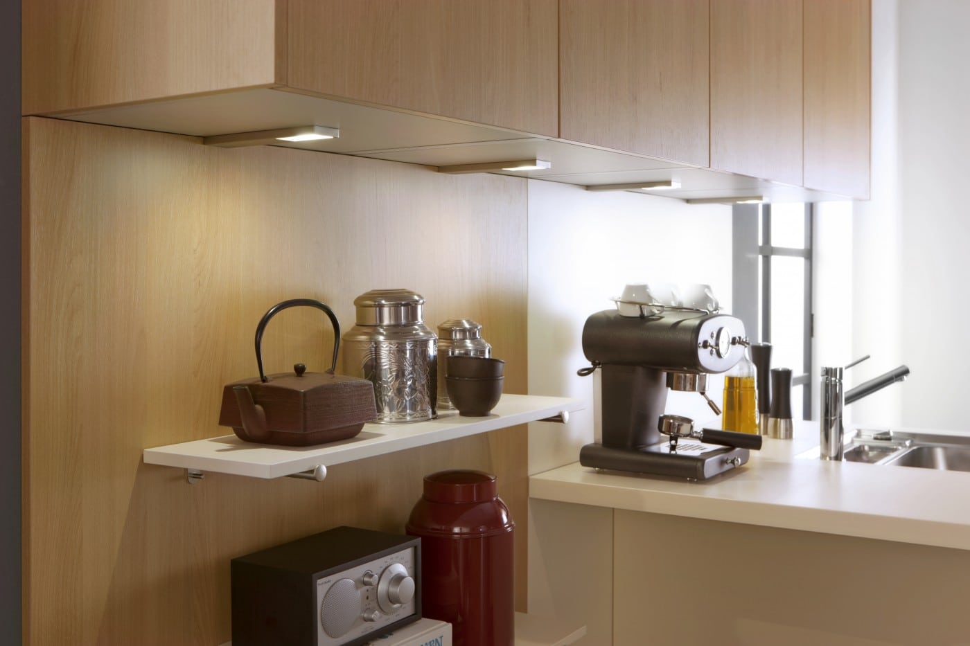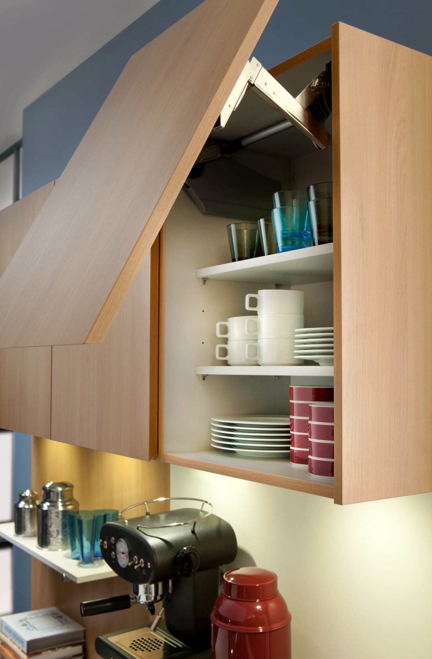 Homeliness and functionality need not necessarily be separate. Light wood décor, combined with magnolia white fronts and cheerful lighting. The opening towards the living room and the integration of living room elements into the kitchen are some of the choices. The isle unit marks the transition from the working to the living area. Colour matching side panels and the worktop flush with the front, give the isle a block-like appearance. Handle-less wall units with attached LED-lights bridge the isle and the open shelf unit.