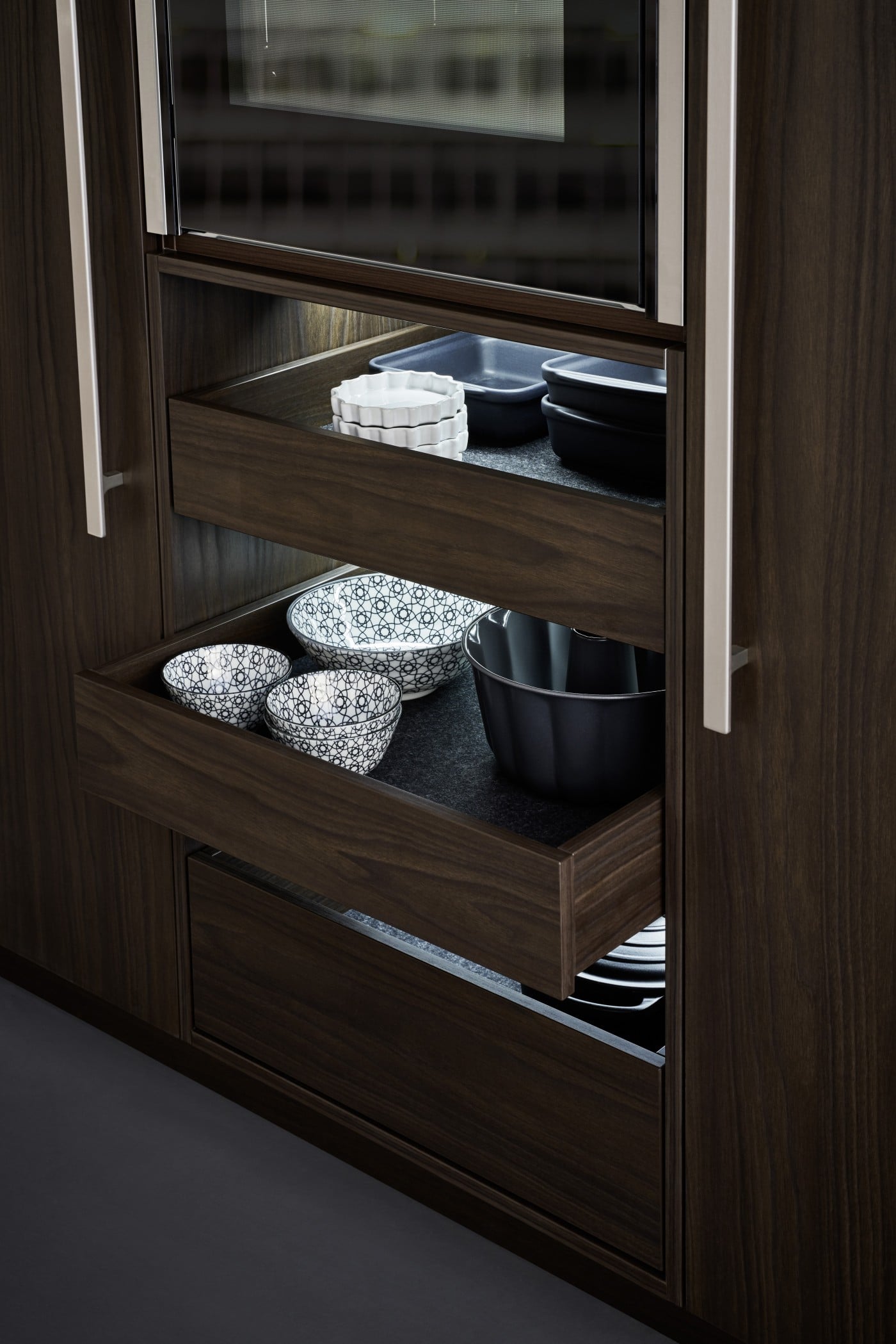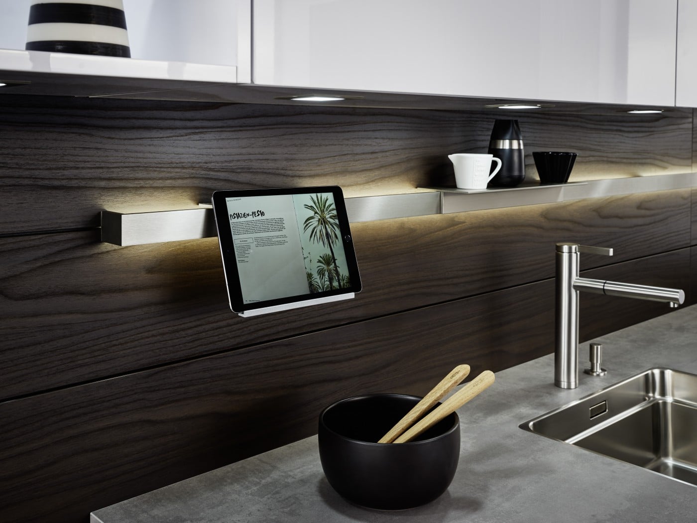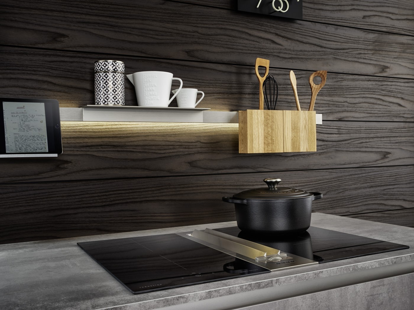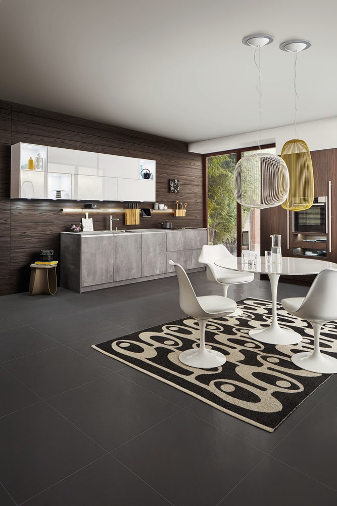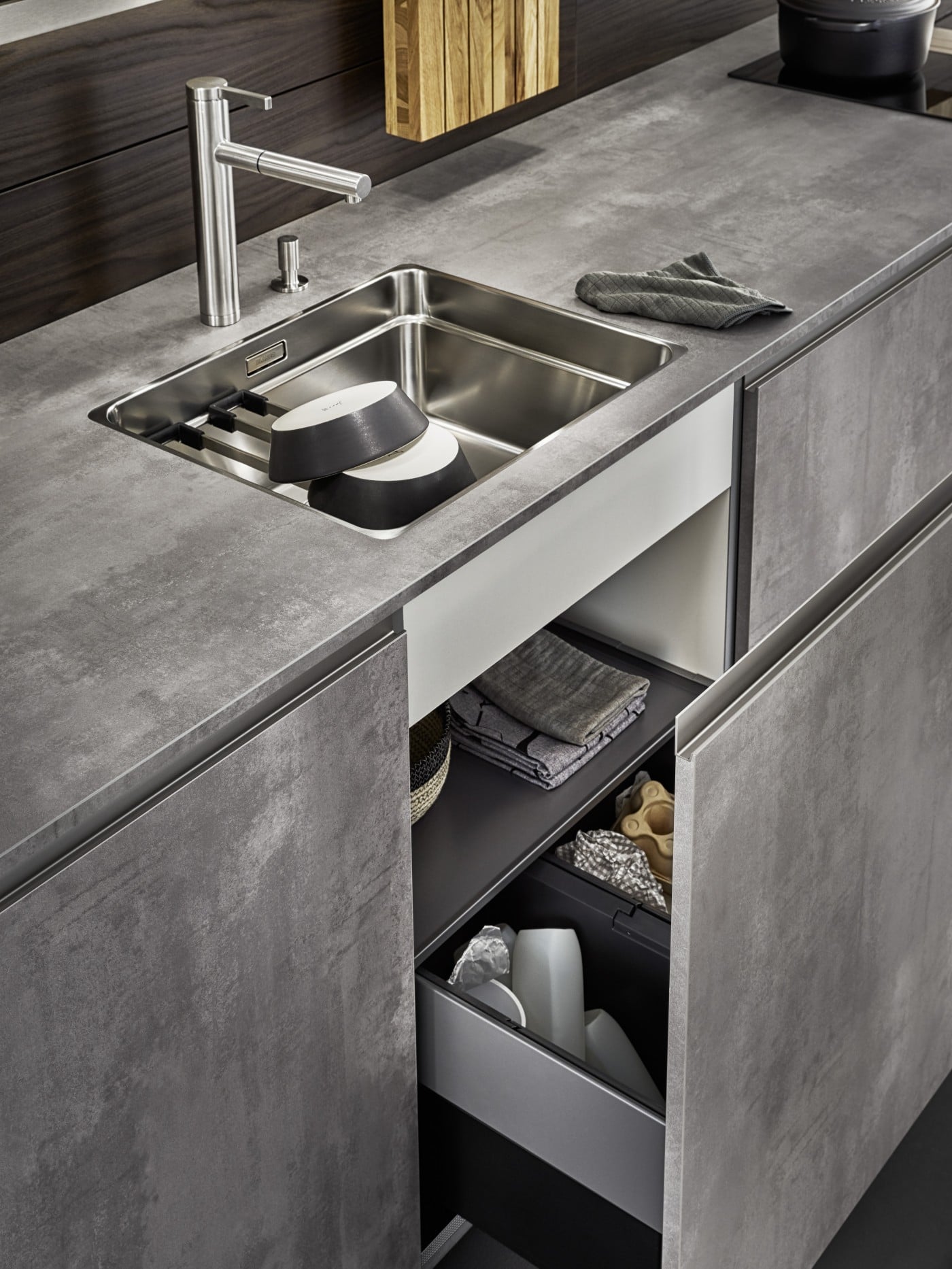 The interior concept comprising cooking run, wall units and tall unit is given a homely touch with a rear panel made of finely structured genuine wood. There is great diversity both in terms of the surfaces and what‘s inside drawers and units. The floor units featuring elegant concrete reproduction are a genuine eyecatcher.