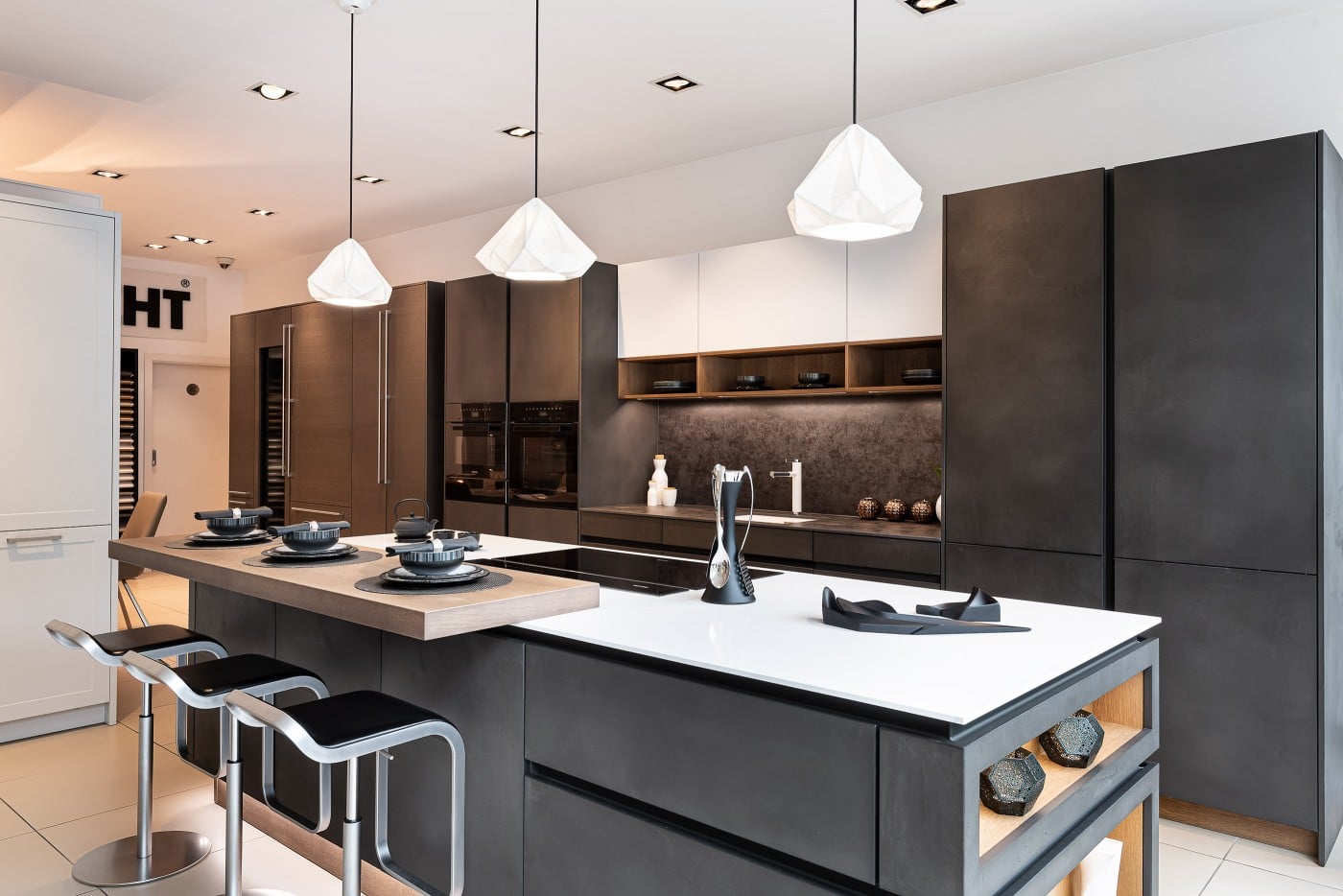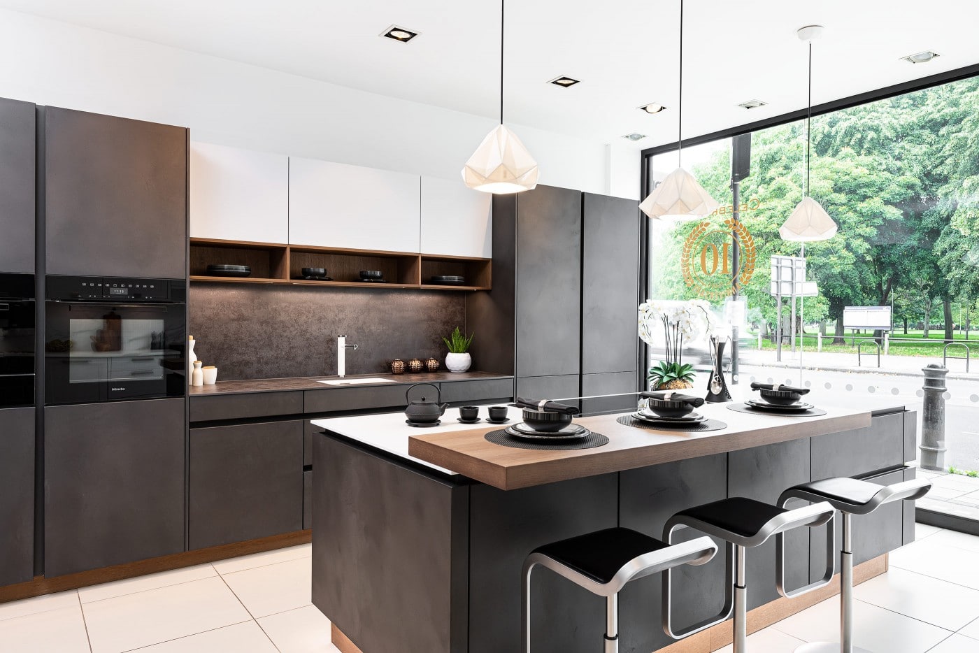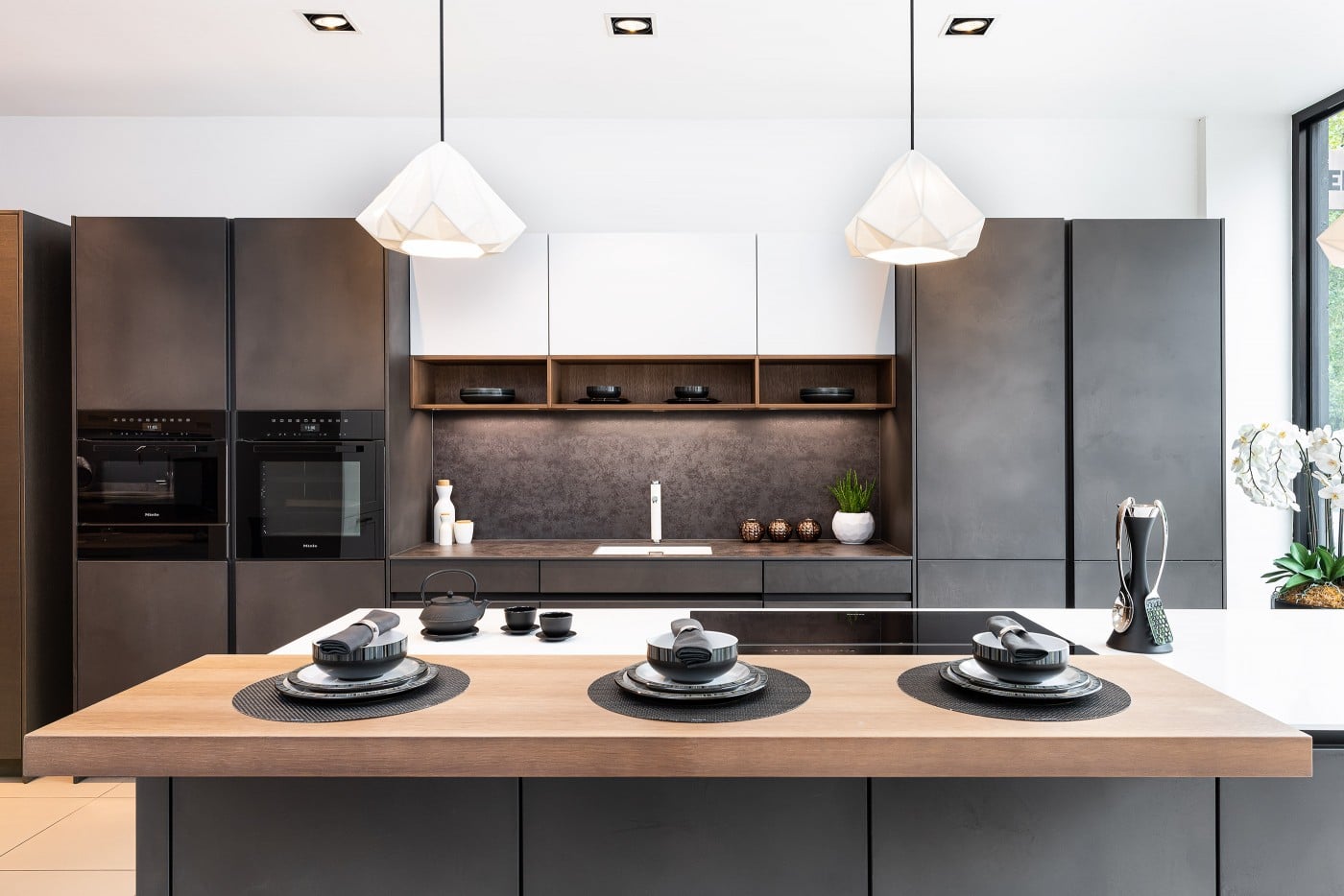 We showcase a huge range of kitchen furniture finishes including matt lacquer, wood veneer, shaker style, gloss, matt glass, laminate wood decor, and concrete to help you select and co-ordinate the finishes for your kitchen.
