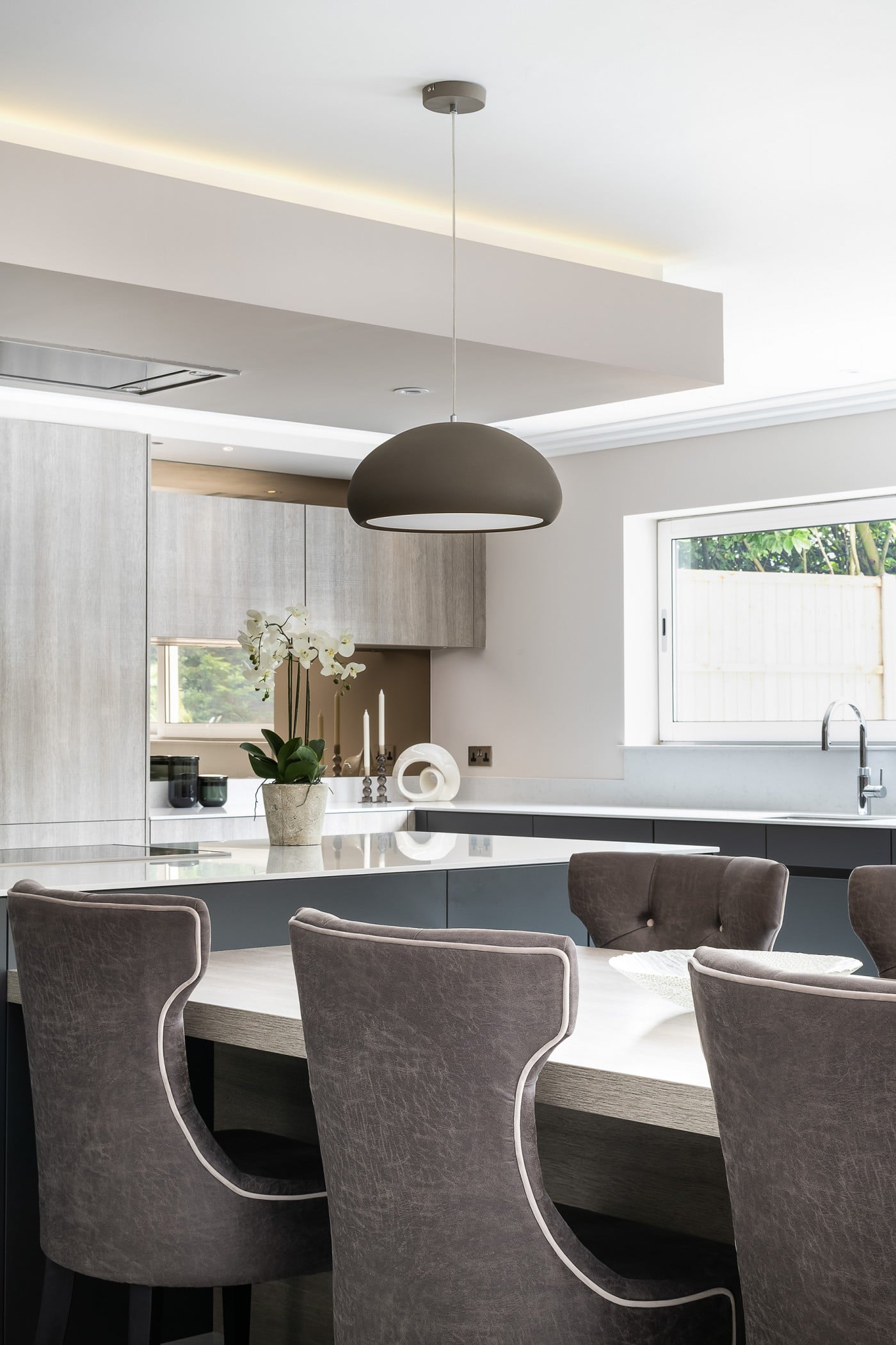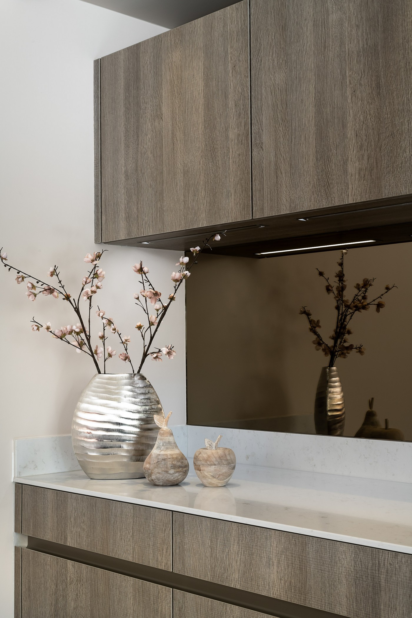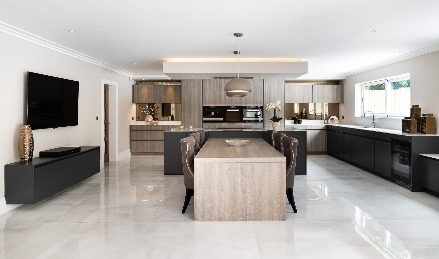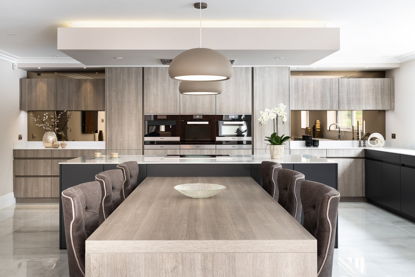 Elan Elegance – A strikingly simple yet stunning kitchen design featuring a T shape island and dining. The clean, neutral brown woodgrain adds elegance and brings a warm feel to your kitchen.