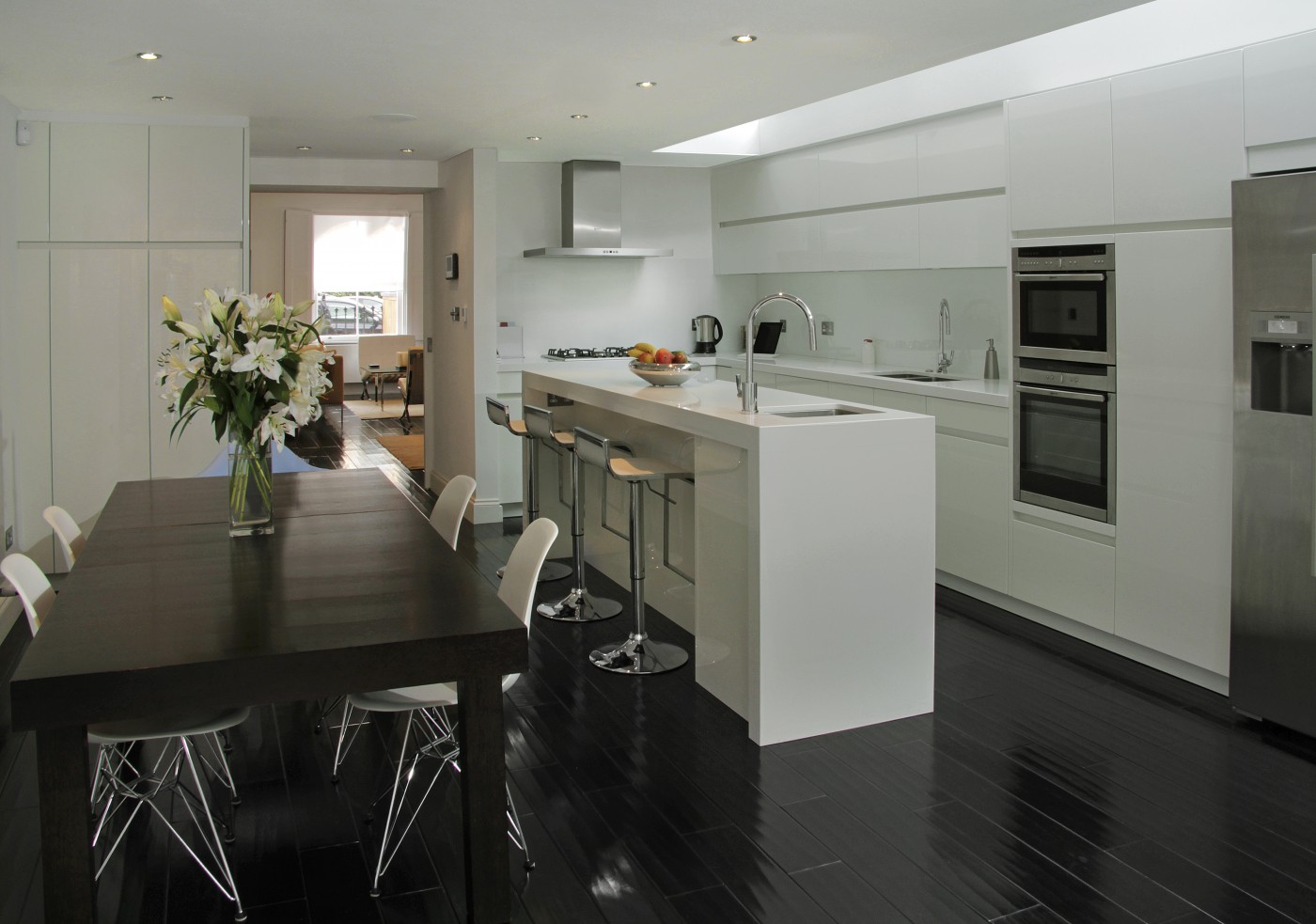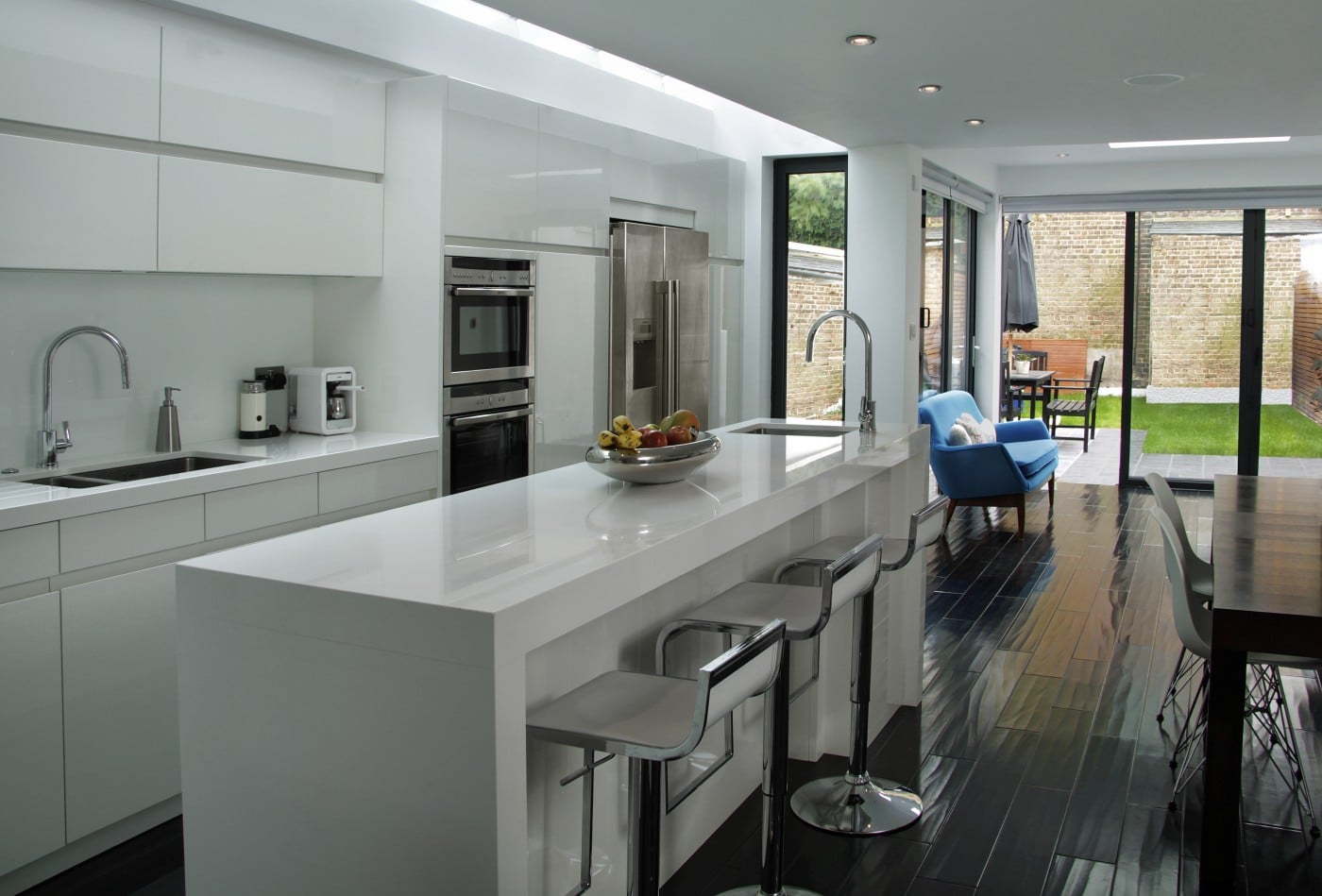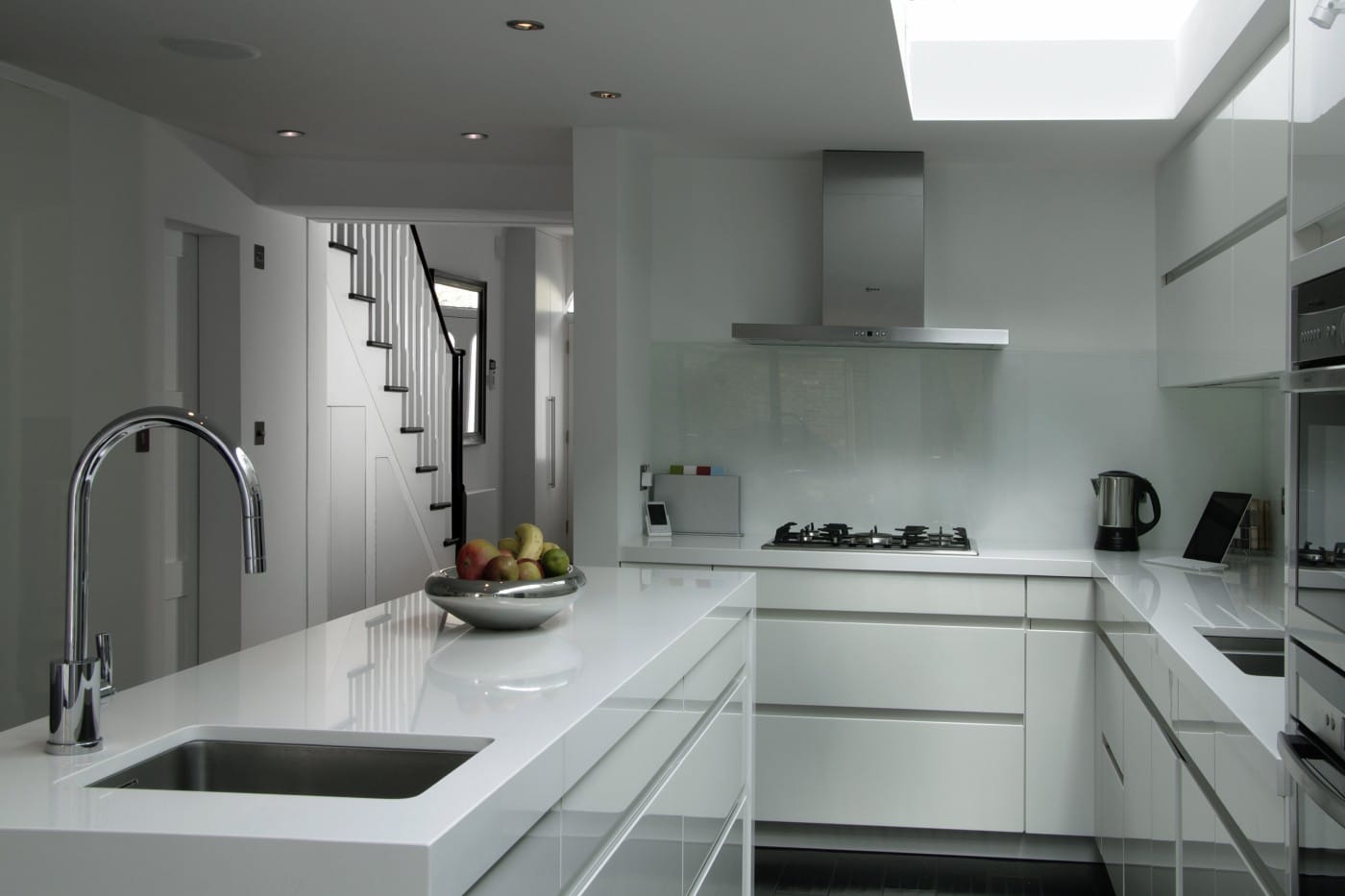 This frosty white modern kitchen uses space to its advantage. Its white glass features are authentic both to look at and touch, lending the furniture a natural quality.